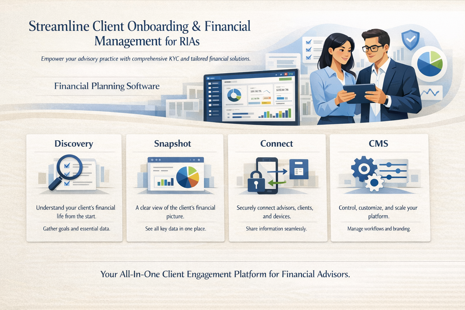 ECF is a client engagement platform designed to help RIAs streamline client onboarding, organize financial data—while supporting Know Your Client (KYC) standards and the ability to make suitable financial recommendations.