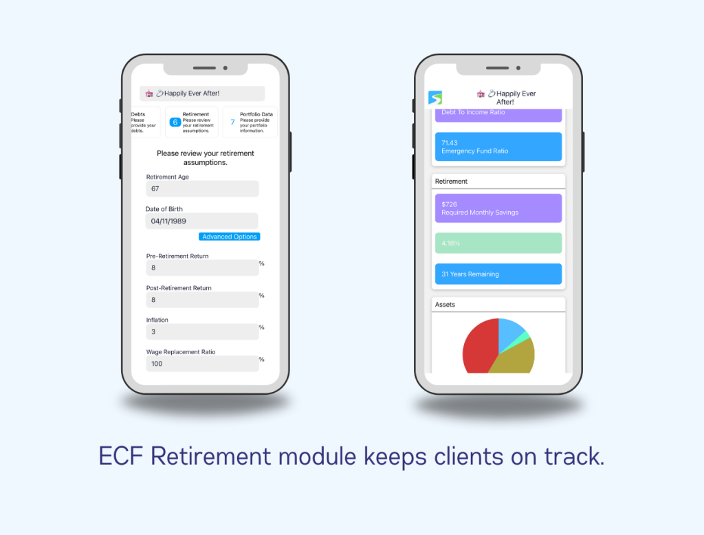 Within ECF Discovery, we’ve also updated the ECF Retirement Planning module. With ECF Retirement Planning, clients have all the most relevant data points related to their retirement available right in the ECF mobile app. Monthly minimum savings goal, total savings progress, and years to target retirement date are all there for your clients to see, so they understand where they are and can track their retirement savings progress.